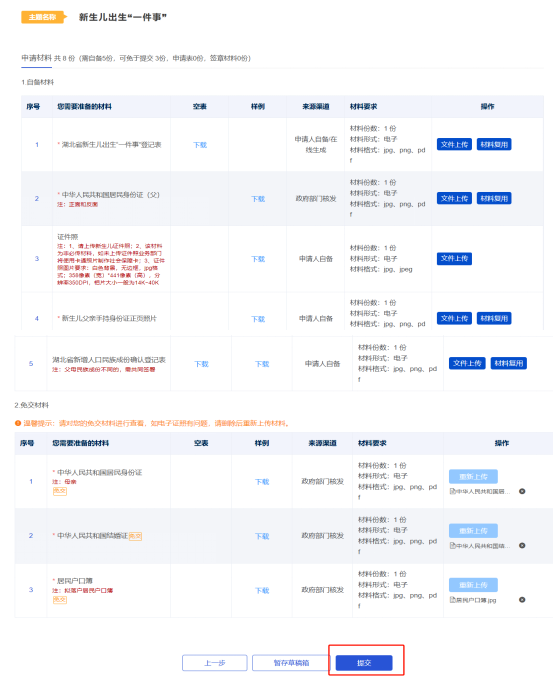 第五步:進入材料上傳頁面后,按照提示要求完成材料上傳,點擊“提交”按鈕就完成了“一件事”主題辦事申請。