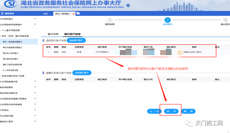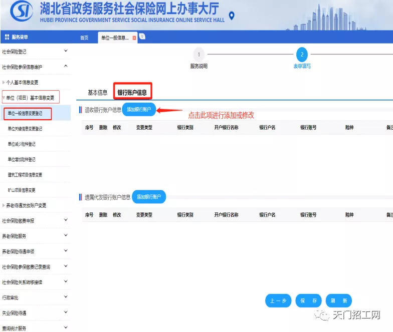 請登錄湖北政務服務網(wǎng),點擊“企業(yè)職工養(yǎng)老保險信息系統(tǒng)”,進入“湖北省政務服務社會保險網(wǎng)上辦事大廳”,點擊“單位(項目)基本信息變更”中“單位一般信息變更登記”,進入“銀行賬戶信息”湖北政務服務網(wǎng):http://zwfw.hubei.gov.cn/