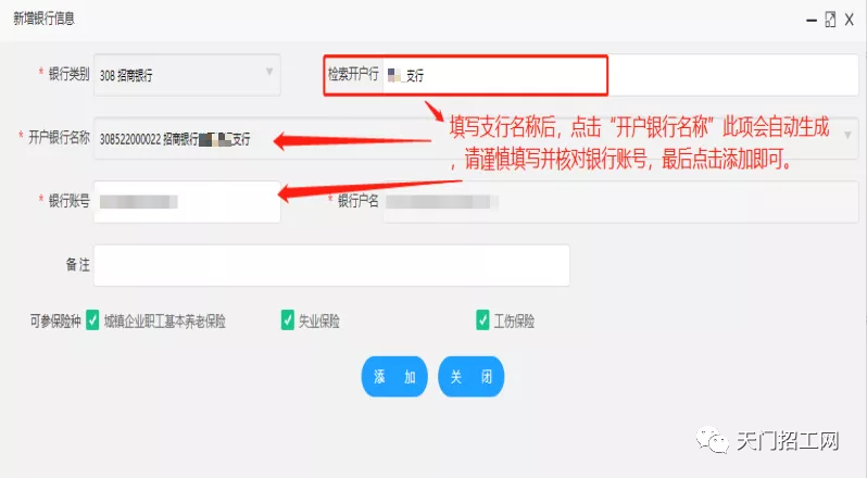 點擊“添加銀行賬戶”,填寫完善銀行賬戶信息。必須在“檢索開戶行”中正確填寫12位行號或開戶支行名稱,如填寫錯誤會導致“開戶銀行名稱”無法自動生成。