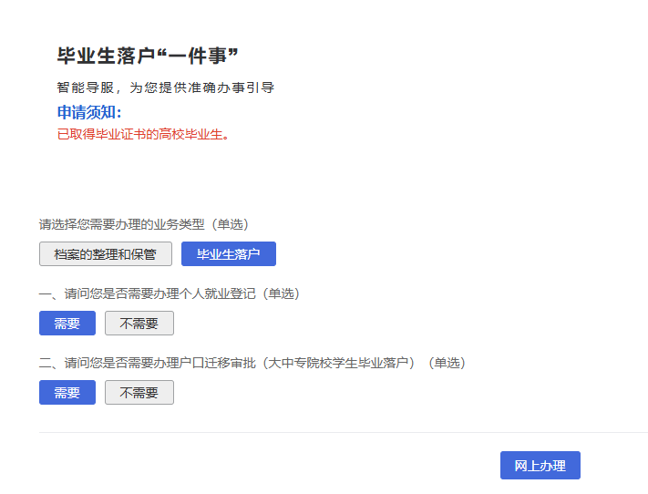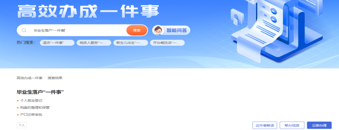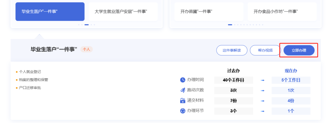 (2)點擊畢業生落戶“一件事”,主題后方有辦事解讀和立即辦理按鈕,點擊“立即辦理”按鈕進入申辦頁面。