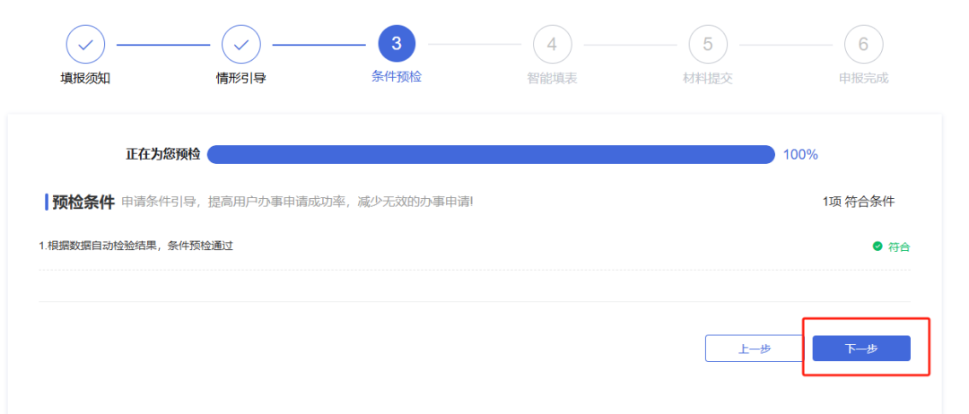 辦事導引勾選完成后點擊“網上辦理”進入條件預檢頁面,條件預檢通過方可進入下一步填表頁面。