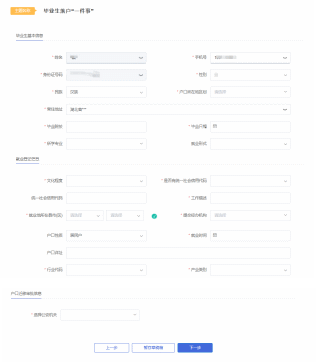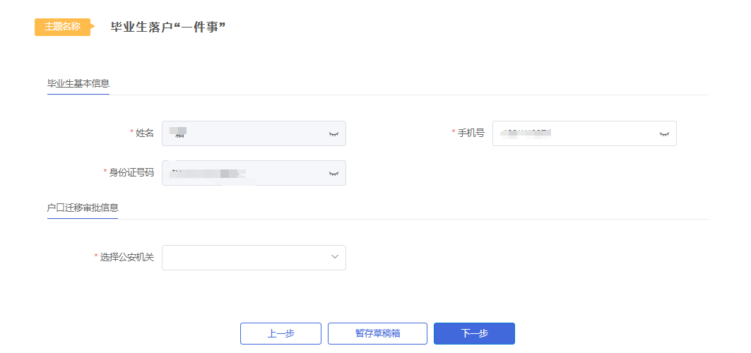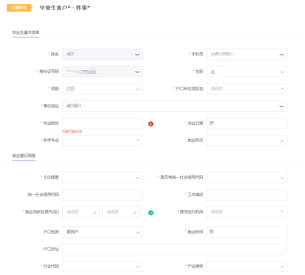 ①如果導引頁面勾選了“需要辦理個人就業登記和戶口遷移審批”,只用填寫畢業、就業相關信息,勾選戶口遷移公安機關,其中姓名、身份證號、手機號、性別、民族、常住地址為“免填寫”字段通過數據共享自動獲取填充。