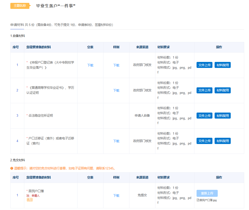 ③如果導引頁面只勾選了“戶口遷移審批”此處需要上傳申報戶口登記表(大中專院校學生畢業落戶)》、《普通高等學校畢業證書》學歷認證證明、合法穩定住所證明、戶口遷移證(省外)或者電子遷移證(省內)4項材料,居民戶口簿為電子證明調用“免提交”。