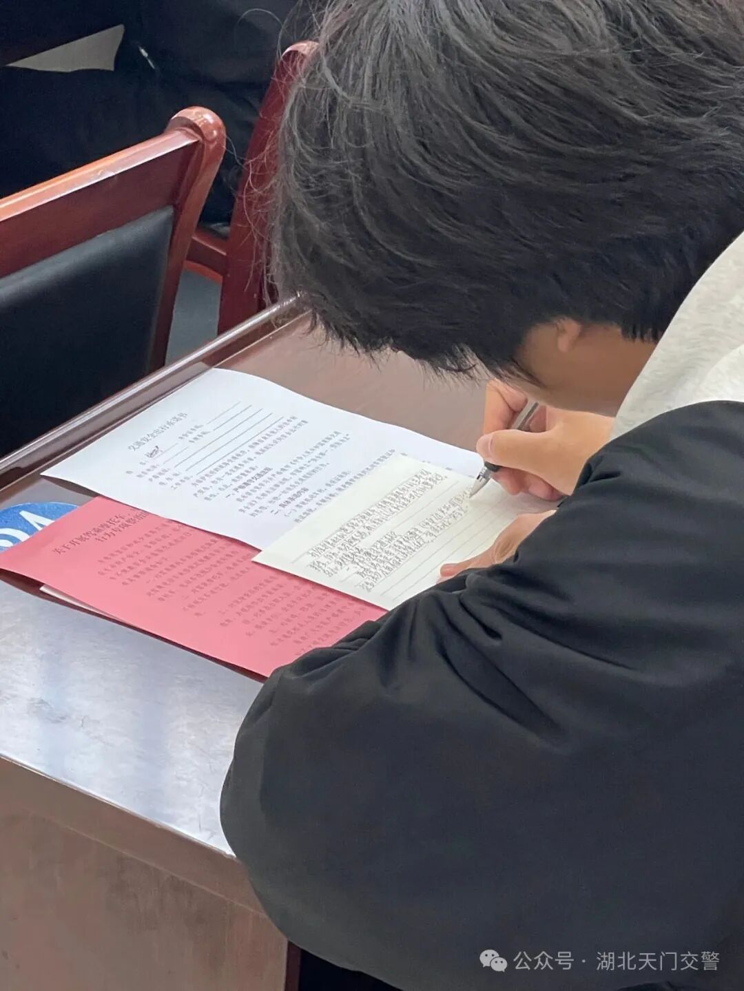 11月4日15時許,天門市公安局交管大隊城區中隊一樓大廳內,10多名摩托車、電動車駕駛員在觀看交通安全警示片之后,有感而發。