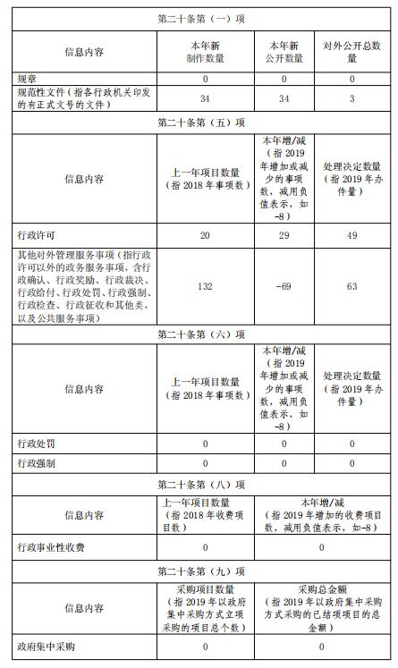 2019年,全鎮累計主動公開政府信急100條,其中通過政府網站公開信息66條,其中包括公文法規類10條、計劃總結類1條、業務工作類3條、政務動態類46條,財政信急類4條等,涉及扶貧、公共衛生、社會保障、環境保護等各個方面。在重點工作信息公開上,我鎮發布社會公益事業建設領域信息4條、公共資源配置信急3條,主要為招商引資、小街小巷建設、危房改造、脫貧攻堅項目庫、民政救助等內容。