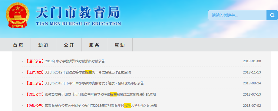 堅持把天門市教育局網站作為政務公開的第一平臺。天門教育信息網現有6個專欄17個子欄目,主動公開了局領導分工、機關科室設置、職責分工和聯系電話、局直所有學校(單位)工作職能、所在地址、聯系方式、招生考試、人事任免、教育教學、德育安全、學生資助等方面的政策性文件,以及主動公開了天門市義務教育階段中小學生入學、轉學的審批、民辦學校(園)審批、教師資格認定、幼兒園等級認定等辦事依據、申請條件、辦理材料、服務流程,極大地方便了群眾各類項事項辦理。截止到目前,通過天門市教育局網站共公開教育信息895條,有力地宣傳了全市教育工作動態。