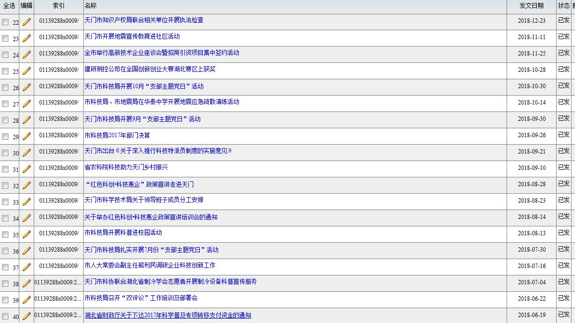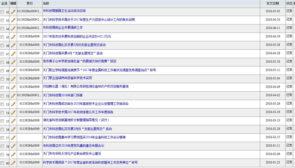 按照市政務電子政務辦的總體工作部署,結合《天門市科技局2018年度政務公開工作要點》的任務分工要求,我局通過各種公開主體發布信息43條,其中領導職能分工1篇,信息公開指南1篇,信息公開年報1篇,政務動態37篇,財政信息3篇。