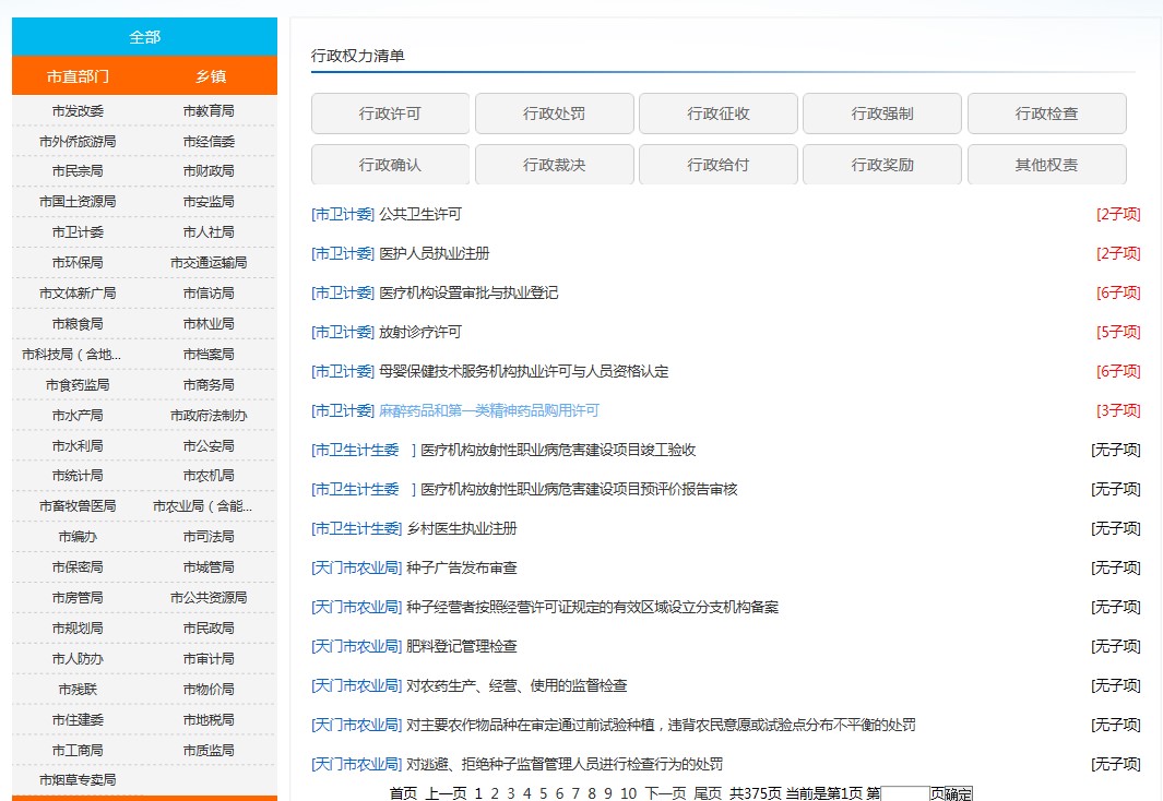 五是推進“放管服”改革信息公開。扎實推進簡政放權公開。狠抓梳理行政權力清單,全市47個市直部門共清理確認、規范要素、集中公開行政職權事項3865項,其中行政許可280項,行政處罰2559項,行政強制182項,行政征收35項,行政給付45項,行政檢查233項,其他類393項;全面推開26個鄉鎮政府權責清單,均公示了79項行政職權事項。大力推進放管結合,優化服務公開,每條職權均增加了在線提交意見建議功能,讓公眾了解放權情況,監督放權進程,評價放權效果。通過市政府門戶網站公開教育、健康、社保、交通、住房、就業、招商、公共事業、企業開辦等9大類主題服務和個人辦事、企業辦事、政府部門服務3大類領域服務,公開水電氣、通信、違章、班線、公積金等便民服務。“信用天門”網站累計公示行政許可、行政處罰、信用紅榜、信用黑榜、法人和其他組織社會信用代碼250余條。推進“互聯網+政務服務”工作,制發并公開了《天門市推進“互聯網+政務服務”實施方案》(天政辦發〔2017〕39號),加大政務服務網上辦理力度。從電子政務外網到市直部門全面配合湖北省行政職權和服務事項管理系統工作,為構建湖北政務云平臺,實現湖北政務網上申報、網上受理、網上審批等政務服務做好各項工作。