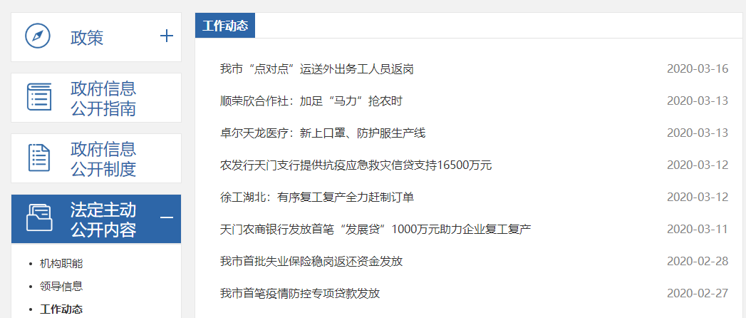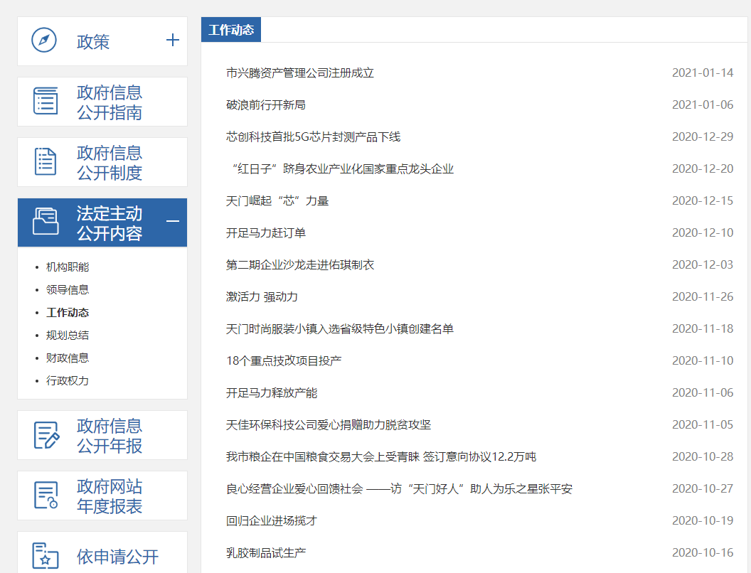 2020年1-12月,中心主動向社會公開發布信息公開指南、機構職能、領導信息、工作動態、規劃總結、財政信息等相關內容,全年共發布政務信息216條,通過天門市人民政府門戶網站、微信公眾號“天門招商”大力宣傳我市招商引資政策、環境、平臺以及其他比較優勢。
