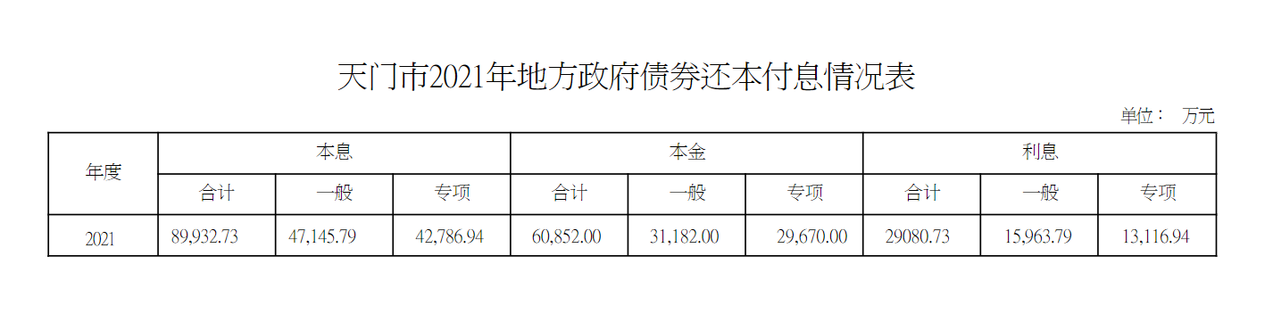 天門市2021年地方政府債券還本付息情況表